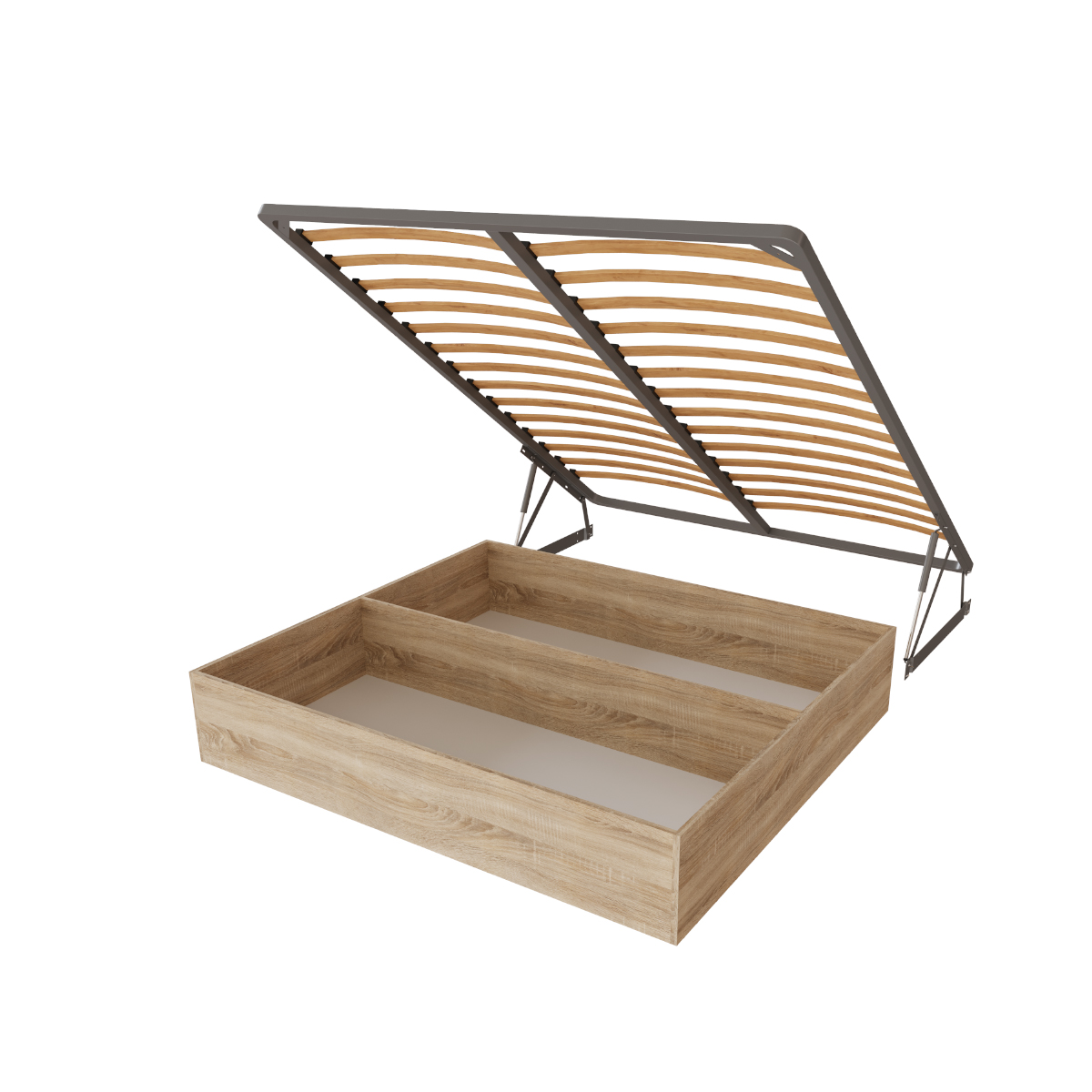 Основание для кровати представляет собой базовую конструкцию с подъемным механизмом, на которую сверху размещается матрас. Также комплектация включает в себя ящик для белья, что очень удобно и экономит пространство комнаты.