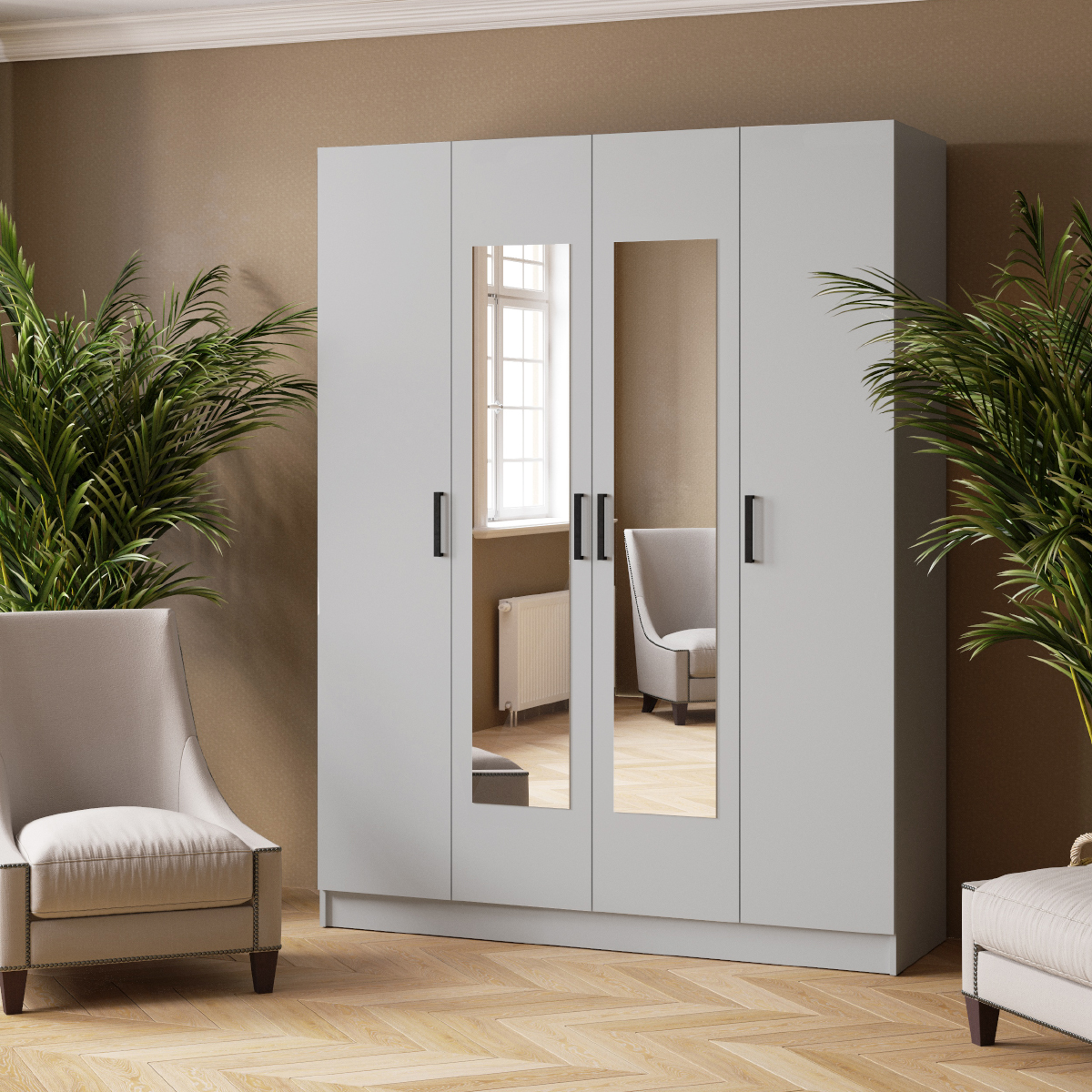 Шкаф Ларс (1,6) имеет четыре распашные двери с контрастными черными ручками и разделяется на три секции: одна содержит две вместительные полки и стационарную горизонтальную штангу для вешалок с одеждой. Две другие располагаются по бокам от центральной секции, и каждая состоит из пяти полок, расположенных одна над другой. Этот платяной шкаф изготовлен из надежной и долговечной ЛДСП: качественные и экологически безопасные материалы гарантируют безопасность и легкий уход за мебелью. Благодаря всему перечисленному, этот платяной шкаф станет значимой деталью интерьера вашей гостиной, спальни или прихожей.