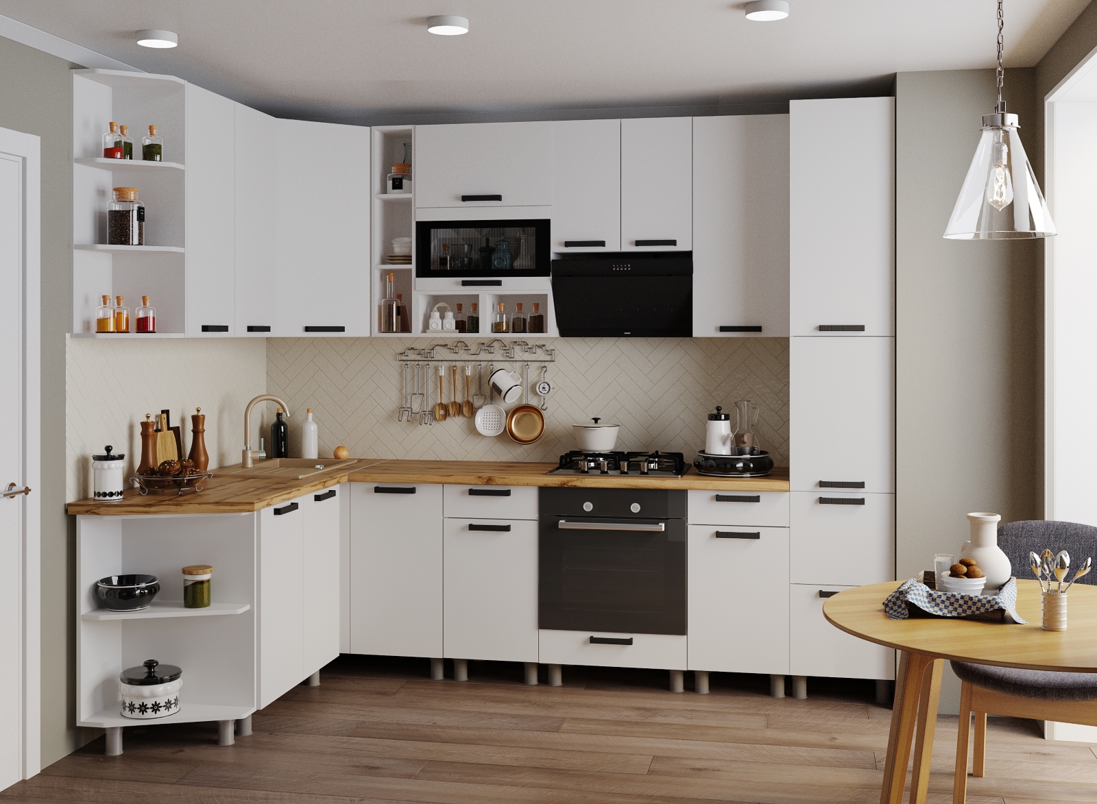 Полная модульная программа подразумевает под собой наличие радиусных верхних и нижних шкафов для окончания композиции кухни.