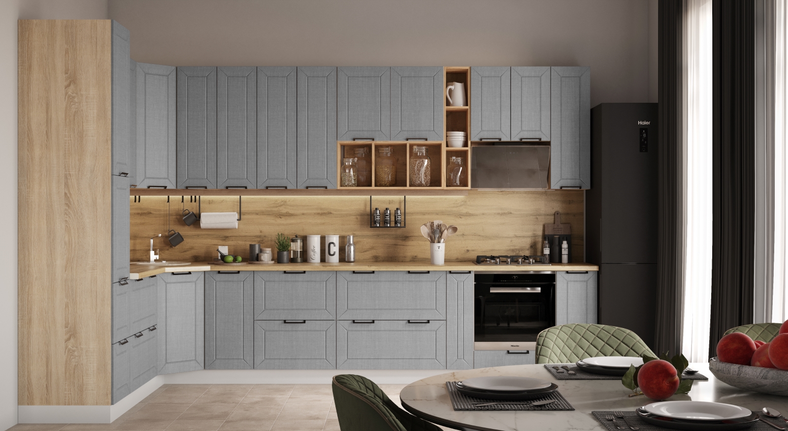 Данная модульная программа подразумевает наличие радиусных верхних и нижних шкафов для окончания композиции кухни.