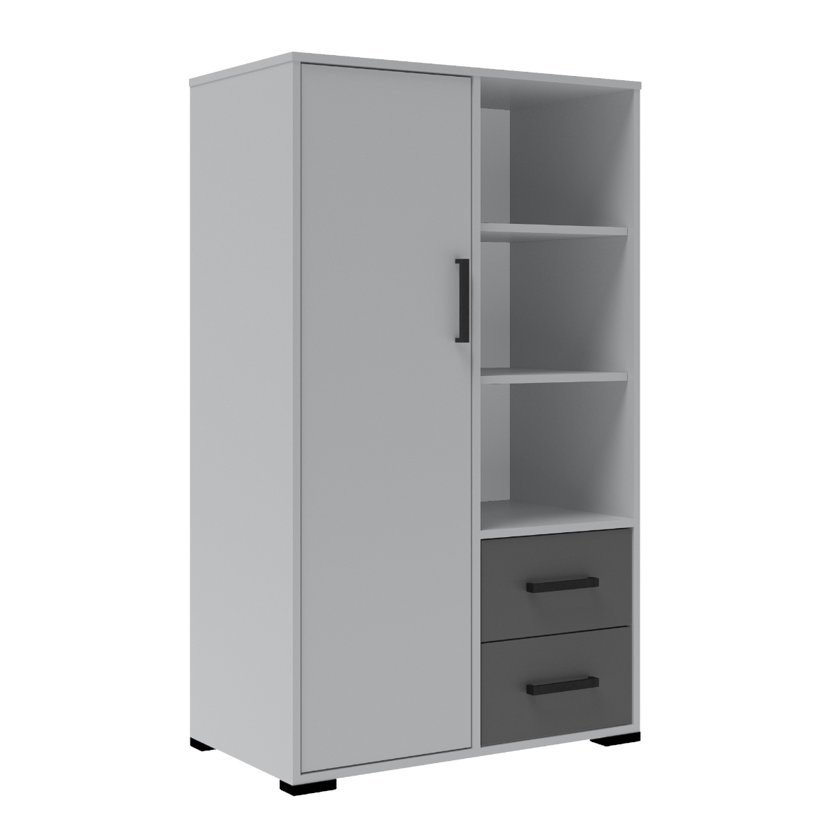 Невысокий книжный стеллаж Лючия отлично подойдет для детской комнаты, как организатор книг, принадлежностей и прочих нужных вещей. У него есть три удобные открытые полки для книг, небольшой техники и быстрого доступа к нужным вещам, два выдвижных ящика для разных мелочей и четыре вместительные полки за распашной дверью.