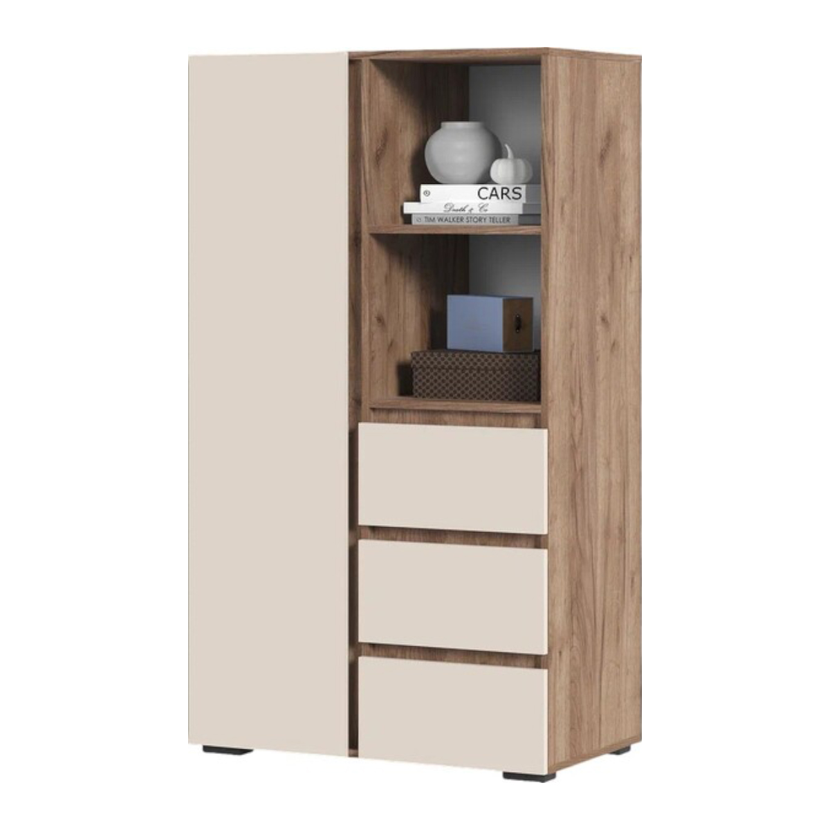 Небольшой шкаф Хелен ШК 03 предназначен для организации хранения вещей и одежды, а на его открытых полках могут разместиться книги или предметы интерьера. В его конструкцию входят три выдвижные ящика и платяная секция с металлической штангой.