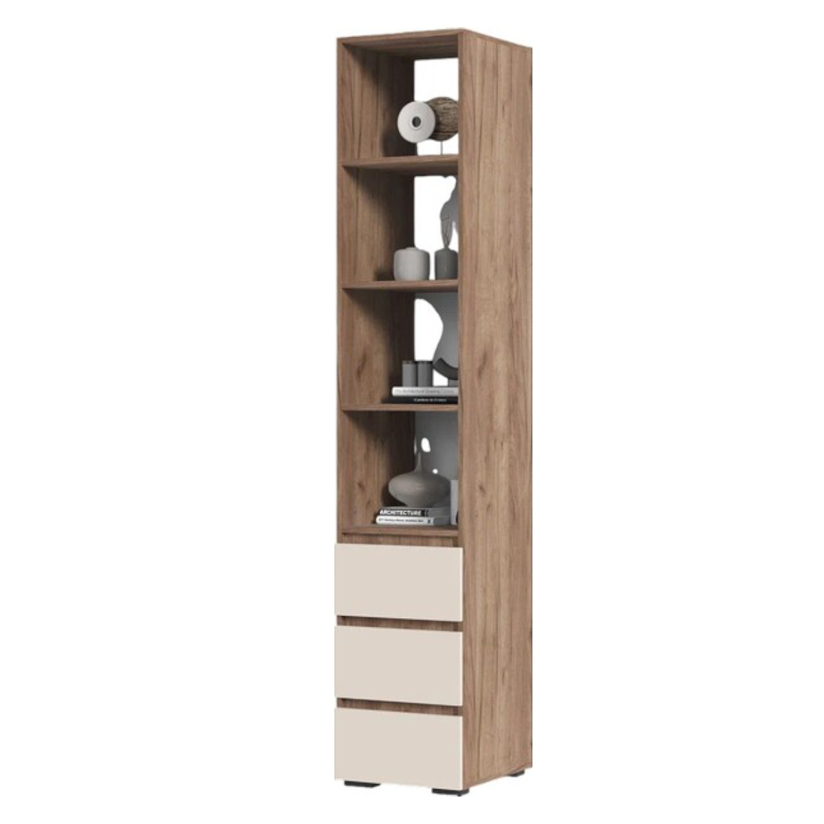 Шкаф-пенал Хелен 02 имеет форму высокого и узкого шкафа. Он отлично вольется в интерьер гостиной, детской или спальной комнаты и предназначен для хранения вещей. Шкаф состоит из трех выдвижных полок снизу и четырех открытых полок, на которых вы можете расположить книги, фотографии или декоративные предметы интерьера.