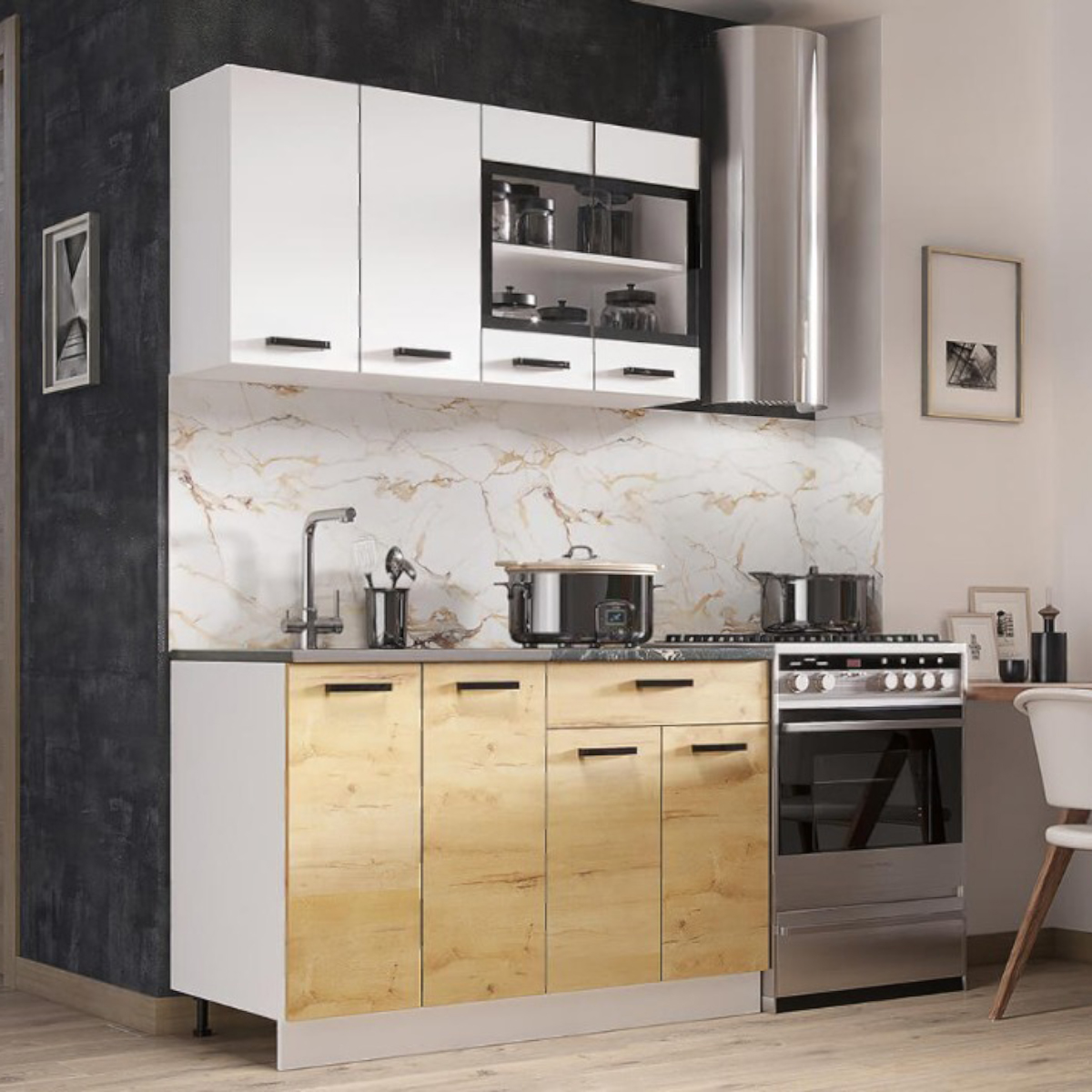 Кухня Брауни 1,2м Белый гладкий/Дуб Вотан со столешницей Мрамор черный/Мальва