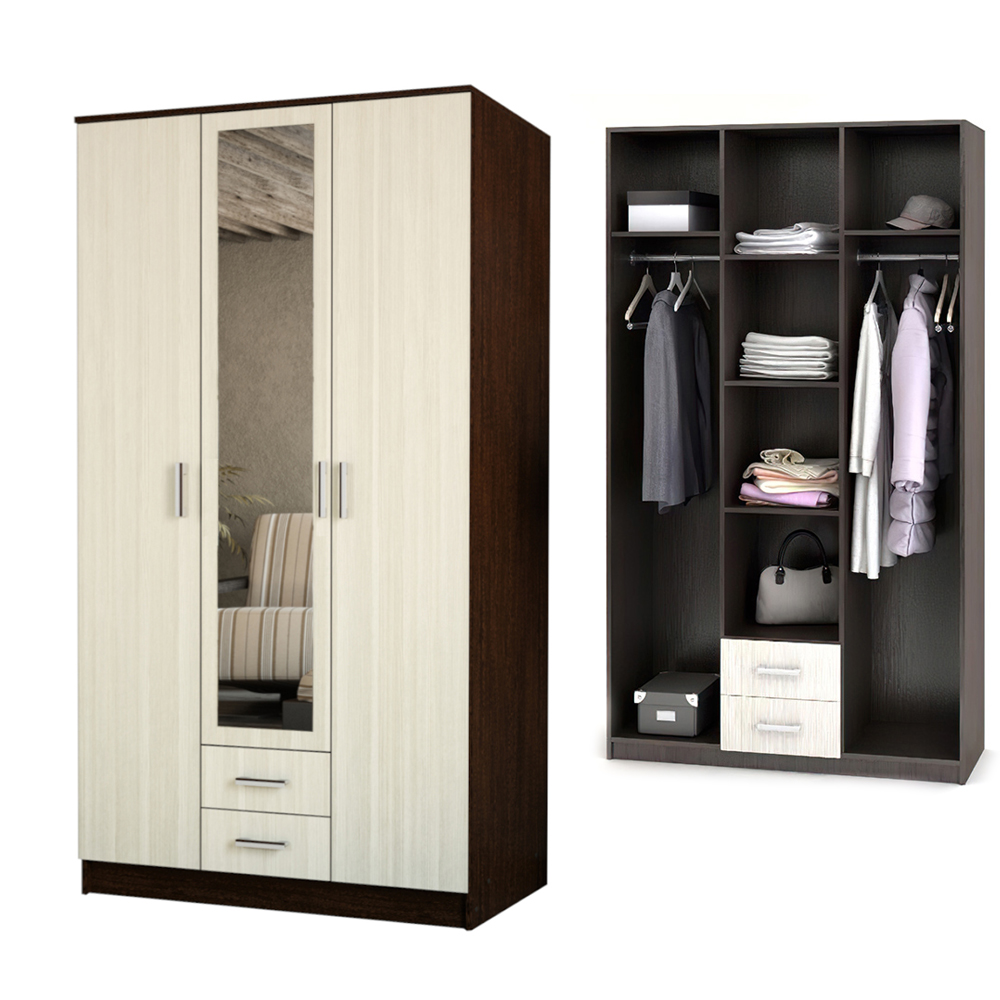 Трехстворчатый шкаф Трио предназначен для хранения вещей, белья и одежды. Обладая комбинированной конструкцией, он функционален и красив: за его распашными створками скрываются два платяных отдела с металлической штангой и пенальный отдел с тремя полками. Внизу же расположились два выдвижных ящика, в которых с удобством разместятся вещи меньших размеров.