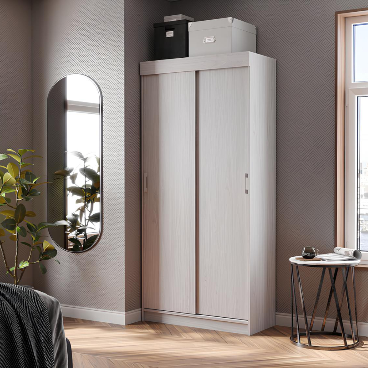 За двумя раздвижными створками, которые легко и плавно двигаются на своих направляющих, расположились два отдела, позволяющих содержать в удобном порядке вещи, одежду и сезонную обувь: с одной стороны это пенальные полки, а с другой - платяной отдел с выдвигающейся металлической штангой для плечиков с одеждой.