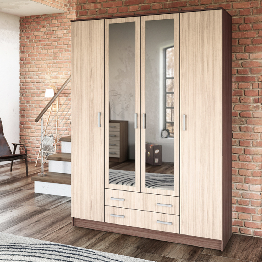 Большой распашной шкаф КВАДРО подарит вашему дому удобную систему хранения и визуально расширит пространство помещения, благодаря зеркалам на двух центральных дверцах. Функциональная и продуманная система хранения представлена двумя вертикальными секциями полок, парой широких выдвижных ящиков и отделением со штангой для вешалок