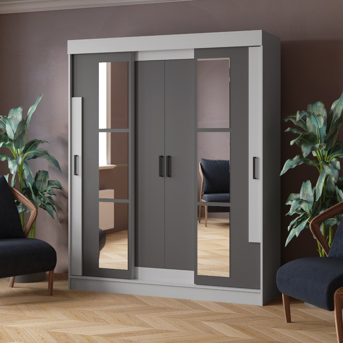 Визуально Шкаф-купе разделен на три секции за четырьмя раздвижными дверями, которые предоставляют доступ к четырем вместительным полкам в центре и двум платяным секциям по бокам. Каждая платяная секция имеет полку сверху и надежную стационарную штангу для вешалок с одеждой. Фасад украшен зеркалами, что не только придаст эффектности интерьеру и визуально расширит пространство, но и позволит вам оценить свой внешний вид при смене одежды.